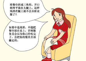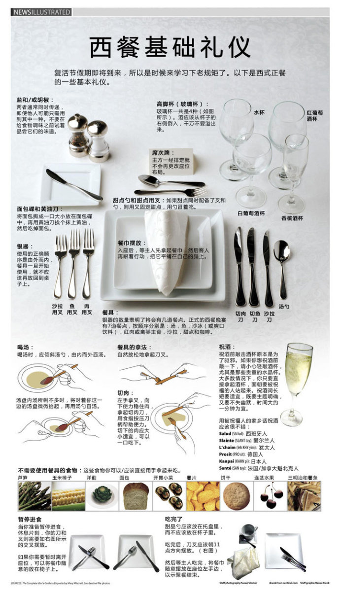 西方人用餐,餐桌上必须使用餐巾,一般家庭均用与桌布同套的餐巾,或抽沙,或刺绣,力求美观大方。餐巾务必洗净熨平,折后置放于餐盘中。使用刀叉进餐时,从外侧往内侧取用刀叉,要左手持叉,右手持刀;切东西时左手拿叉按住食物,右手执刀将其锯切成小块,然后用叉子送入口中。使用刀时,刀刃不可向外。进餐中放下刀叉时,应摆成“八”字型,分别放在餐盘边上。刀刃朝向自身,表示还要继续吃。每吃完一道菜,将刀叉并拢放在盘中。如果是谈话,可以拿着刀叉,无需放下。不用刀时,也可以用右手持叉,但若需要作手势时,就应放下刀叉,千万不可手执刀叉在空中挥舞摇晃,也不要一手拿刀或叉,而另一只手拿餐巾擦嘴,也不可一手拿酒杯,另一只手拿叉取菜。要记住,任何时候,都不可将刀叉的一端放在盘上,另一端放在桌上。每次送入口中的食物不宜过多,在咀嚼时不要说话,更不可主动与人谈话。