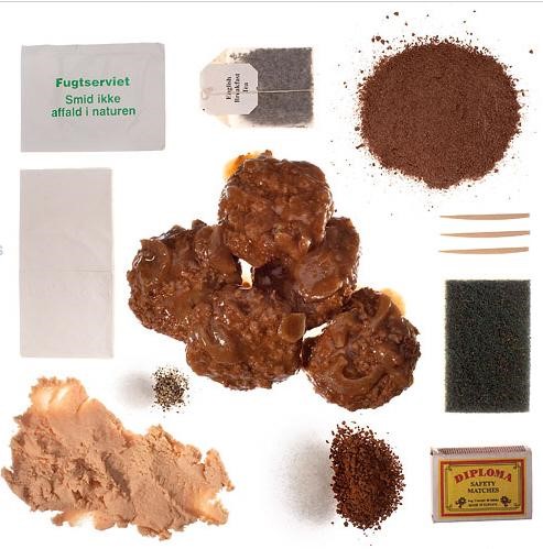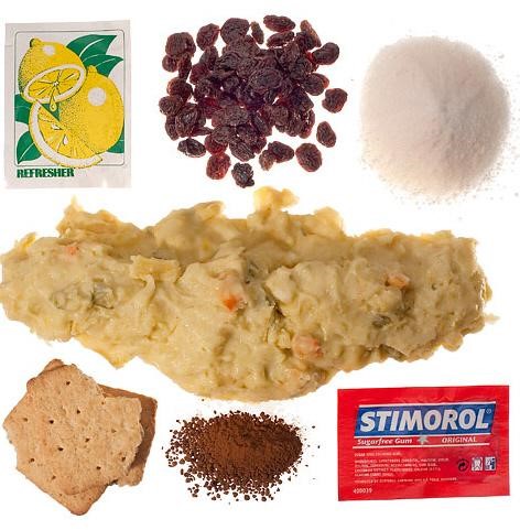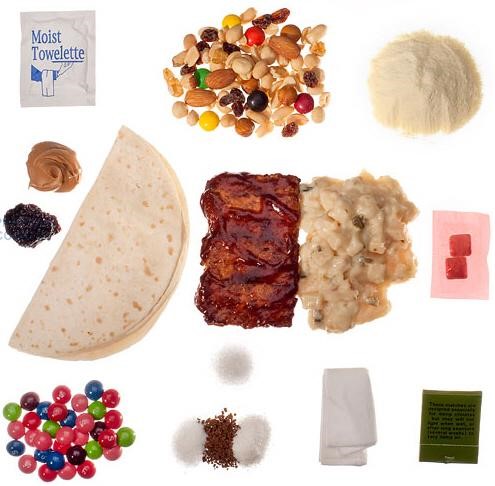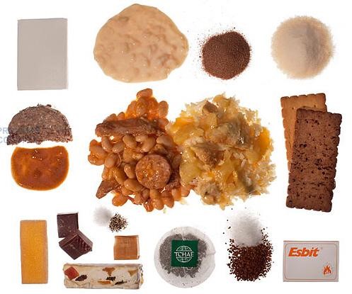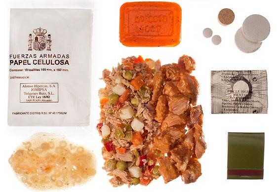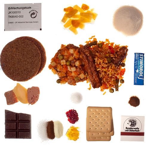 马铃薯红烩牛肉,牛肉烤肠,裸麦面包,牛肉,软奶酪,水果沙拉,饼干,酸莓杏仁,巧克力,速溶果汁粉,速溶咖啡,茶粉,糖,浓缩奶油,湿巾,火柴,盐,口香糖