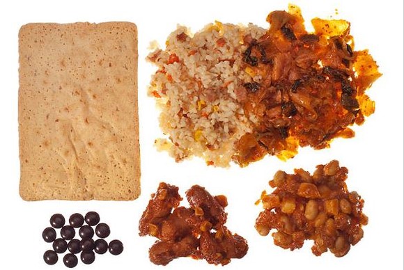 牛肉大麦粥,牛肉条,饼干,油炸鲱鱼,香肠,鸡肉汤,冰茶粉,速溶橘子粉,糖,湿巾