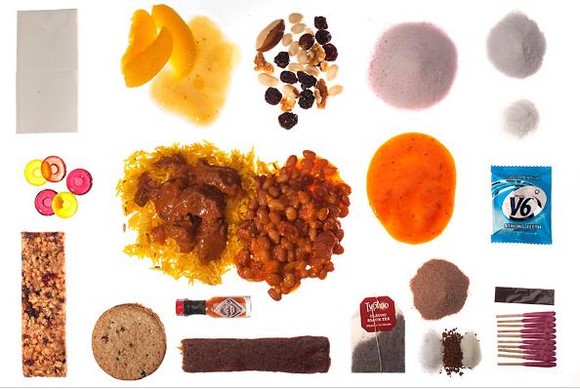 咖喱羊肉,培根煎蛋,米肉饭,番茄罗勒汤,切成小块的桃子,什锦水果,什锦坚果,什锦热带水果,红莓谷物棒,草莓水果棒,水果燕麦棒,水果浓汁,硬糖,速溶覆盆子粉,热巧克力粉,速溶覆盆子口味电解质补充粉,速溶草莓粉,辣酱油,茶包,速溶咖啡,奶油,糖,口香糖,纸巾,火柴