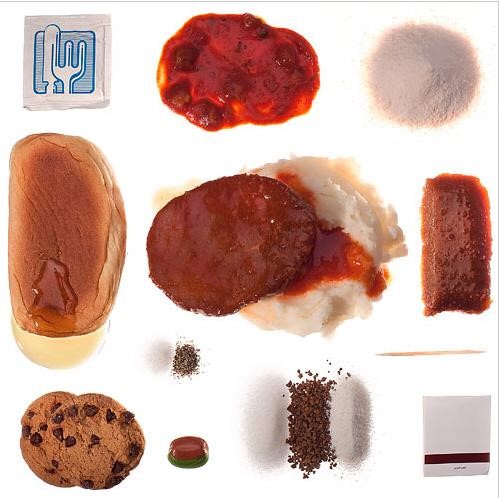 瑞士牛排,土豆泥,面包,番茄浓汤,速溶桃汁粉,薄荷巧克力糖,薯条薄饼,蜂蜜,速溶咖啡,糖,奶油,盐巴,辣椒粉,湿巾,火柴,牙签
