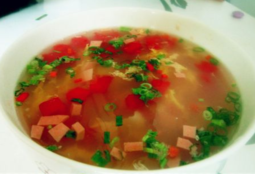 做法:准备胡萝卜、香肠、西红柿、小葱,洗干净,然后把所有蔬菜都切成小丁,备用。上锅烧水,水开了加入胡萝卜丁。然后在加入 香肠丁 和西红柿丁 ,继续煮片刻。把鸡蛋打散,然后倒进锅中,注意不要一下倒进去,要,慢慢的到。然后加入少许的盐 鸡精,出锅。最后在淋上少许的香油,搅拌起来,就可以喝汤了。