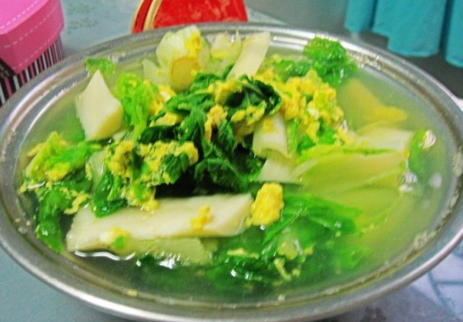 做法:青菜洗净,切短。鸡蛋磕开,打撒。锅中放水和切片的鞭笋一起先煮。一会儿后,就加入蛋液,很快就起锅。