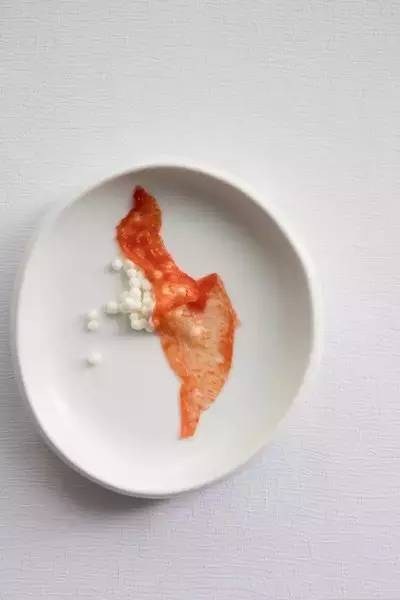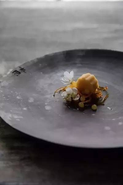 一道意境小食却绝不简单,醃渍入味的柑橘丝如水晶帘幕般,带来幽幽苦涩,搭配京城传统小吃香甜豌豆黄,给人一种痴恋的感觉。而分子料理方式制成的水晶珠,更带给口中爆裂的新奇滋味。