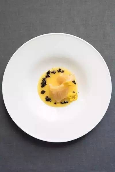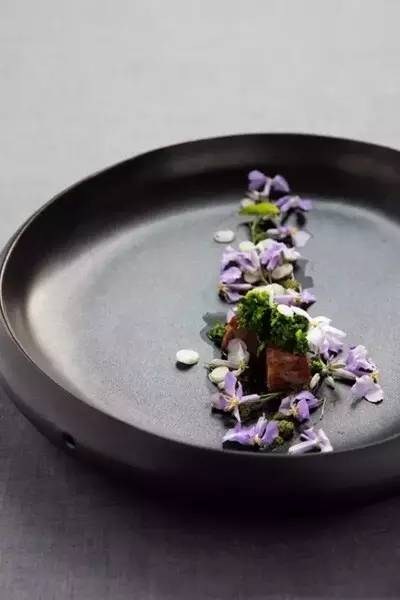 “乍暖还寒后的那片浅绿鹅黄”便是这道菜所展现的意境。浓郁的红花汁如纯金色的凝脂般令人口齿留香,炖制的花胶筋道刚刚好,回味后那一阵阵的高潮真是爽翻了!再加上用黑醋制成的“鱼子”,入口瞬间爆裂,酸甜的口感搭配香浓鲜辣的红花浓浆感觉,让人一下子浑身酥麻起来。