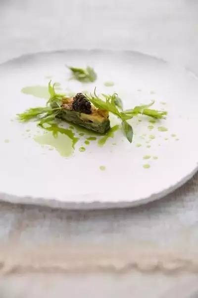 一池碧绿的春色满园,用二十年花雕酒和高汤熬制的清汤沁人心脾,酒香浓郁令人沉醉,真想一纵跳入清池化身春天仙子,与汤中迷你的baby豌豆似小蝌蚪般游弋玩耍。做成鹌鹑蛋大小的如美玉般的鱼丸其实含有惊人馅料,一颗为香气浓郁的黑松露,一颗为温润顺滑的蛋黄酱,每一口都带给人非凡的惊喜。