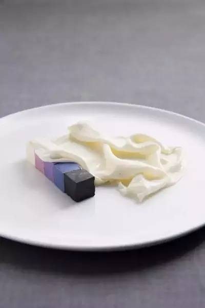 紫色系的渐变色彩慕斯,令人眼前一亮!尤其是搭配上一抹如丝绸般晶莹透亮的双皮奶皮,真是美极了,可谓中西合壁式的甜点超级创新!口感冰爽顺滑的小块彩色慕斯甜度适中,从浅色开始吃起,随着颜色的变幻,味道也会随之变化,真是一道心意十足的美味!