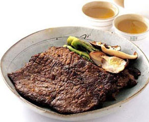 传统上,韩国烤肉都采用牛小排,牛小排是牛胸腔左右两侧的带骨肉,肉质鲜嫩。牛小排的形状长,不易烧烤,要记得翻面,让肉受热均匀,肉烤至变色后,以专用的牛排剪,剪成适口的小块。一时吃不完的肉,堆栈于剪剩的骨头上,可避免烤焦。将烤好的肉沾点味噌酱。最后将烤肉包在生菜里,加点蒜头或小菜,整把送进嘴里。味道美极了。韩国烤肉的绝妙之处在于吃的时候必须用生菜包裹。翠绿欲滴的绿叶包裹着刚刚烤就的肉片,再加上一些蒜片、胡萝卜段、青瓜段,蘸上一点甜辣酱塞进嘴里,清香并着肉香和酱香,尚未咀嚼已经是满口生津了,蔬菜的清甜恰好中和了肉食的油腻,令人胃口大开,欲罢不能。