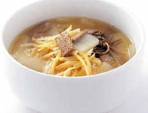 酱汤泡饭是把牛肉和萝卜熬熟后取出来切成片加佐料,再往汤里泡饭与加佐料的肉和萝卜、蕨菜、桔梗、黄豆芽一起吃的一种饭菜。可以放牛肉或鸡肉熬汤,也可以放面条吃。为除膻味放补刻佳你(除味的一种调料)熬熟后取出。也可以放欧芹杆、芹菜、洋葱、胡萝卜熬熟后取出。蕨菜根据个人的嗜好可以不加。