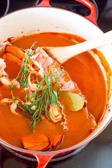 在西餐中,就连龙虾壳也同样是极其美味的食材,油中煎炒之后加水炖煮,可以制成许多颜色鲜亮、风味浓郁的酱汁和汤品,常见的龙虾汤、法餐中经典的Nantua酱汁都离不开龙虾壳。