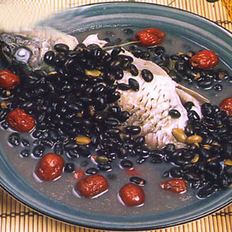 原料:鲤鱼一条约500克,乌豆100克,红枣4个,陈皮一小片。