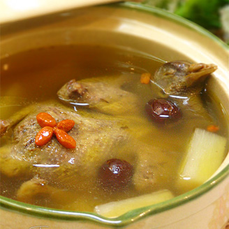做法:用大姜片同鹧鸪、瘦肉飞水后,连同瑶柱、南北杏、川贝放入炖盅加水加盖,隔水猛火炖20分钟,转慢火炖两个小时即可。