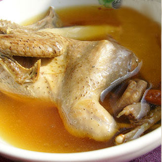 做法:将水鸭切块飞水,花旗参洗净切片,加生姜一片,放入炖盅内,加水250ml,隔水炖2小时即成。