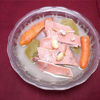 方法:猪舌用开水烫过,刮去舌苔洗净,青、红萝卜去皮洗净切角块,陈皮浸软刮瓢洗净,先清水滚开放入青、红萝卜、陈皮、蜜枣煲1小时,加入猪舌再煲至猪舌够稔为止调味。