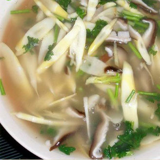 用料:香菇25克,竹笋15克,金针110克,清汤300克。