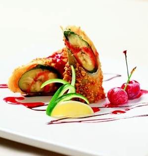 食材:香蕉1条,紫菜叶2张,杏仁碎30克,春卷皮1张,鸡蛋浆1只,草莓果酱适量