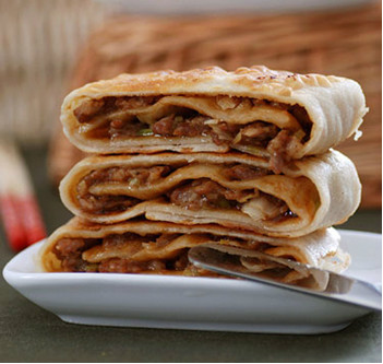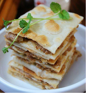 2. 面皮擀成一张大薄饼,分成四块,一块留空,其余的铺上肉馅儿,一层一层对折,把馅儿盖住,最后成一个扇形,封口。