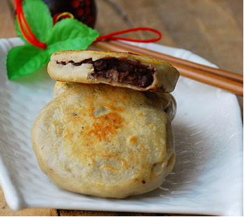 4. 放入豆沙馅,包成包子状,翻过来按扁。锅内抹一层油,放入馅饼,两面煎黄。