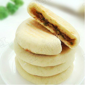 3. 放上馅,包成小包子,扣在案板上,按一下;电饼铛抹油,提前烧热后放入馅饼,两面烙成金黄色即可出锅。