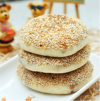 4. 室温饧发10分钟,饼上刷少许水,撒白芝麻。电饼铛里擦少许油,上下火,放入肉饼,盖盖烙至两面金黄即可。