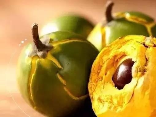 果实球形,未熟时绿色,成熟果黄绿色至橙黄色,光滑,皮薄,果肉橙黄色,富含淀粉,质地似蛋黄且有香气,含水量少,味略甜。其味道口感介乎于番薯和榴莲之间。种子通常1-2粒,近圆形或椭圆形。果实12月成熟,采收后需要后熟4-7天方可食用。