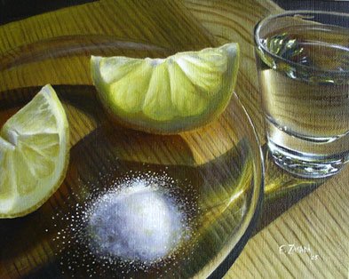 特其拉酒最传统的喝法,即以细盐洒在左手背靠大拇指处,然后用舌头舔一些盐,再将一片柠檬放入口中嚼汁,接着大口喝下整杯酒,此时盐清咸、柠酸涩、酒热辣,混合成一种协调舒服的味道,个中滋味,不喝不知,美啊!