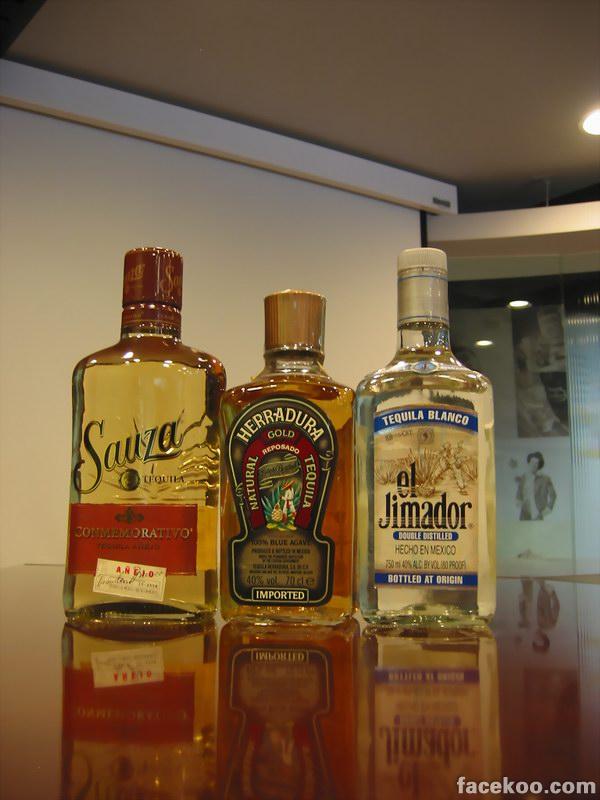 以下是几款不同牌子的TEQUILA,左起至右依序: A?ejo Mixto,Reposado 100% Blue Agave,与Blanco Mixto。酒精含量均为40%