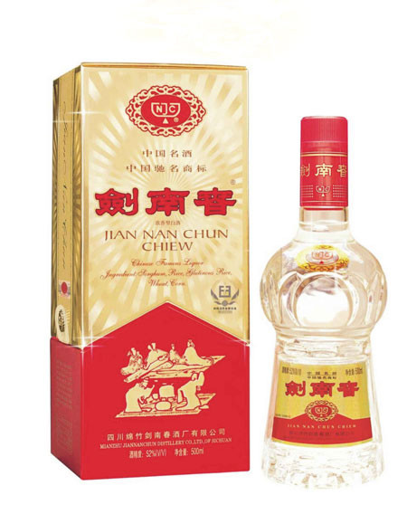 现产于四川省绵竹县酒厂,是我国有悠久历史的名酒之一。唐代以“春”命酒,绵竹是当年剑南道上一大县,由此得名。相传唐代李白曾在绵竹“解貂续酒”,有“士解金貂,价重洛阳”的佳话。以高粮、大米、糯米、玉米、小麦五种谷物为原料,经精心酿制而成,属浓香型。酒度有62度和52度两种。特点为芳香浓郁,醇和回甜,清洌净爽,余香悠长。