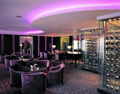 酒吧鲜艳的紫罗兰色和堆砌着几何图案地毯、谐意的沙发真丝靠垫,再配合窗外华丽的外滩夜景和优美的古典建筑江岸,把整个酒吧的色调烘托得完美无比。