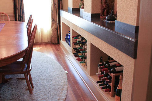 墙上的壁柜凌乱却有规划,收藏的美酒置于其上,半开放式的设计美观又保持着空气的流通,有利于美酒的储藏。站在它们面前,摇晃着高脚杯,边欣赏这些富含品味的“装饰”,边享受舌尖上味蕾不断散发出的幸福感。