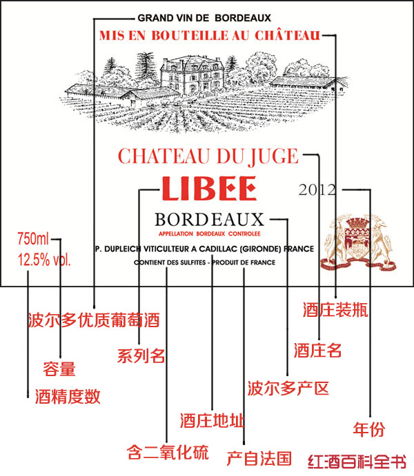 法国波尔多葡萄酒的酒标上有很多具体信息,一般会包括酒庄名称、酒精含量、容量、酒商、年份、装瓶酒庄、法定产区名称、列级信息、葡萄酒类型和二氧化硫含量等。详见下图: