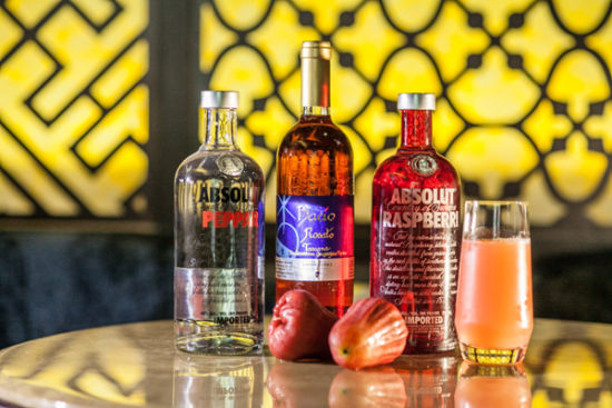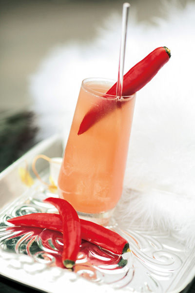 把莲雾切片压成果蓉,加入酒品与冰摇匀,隔渣后加入番石榴汁,以辣椒饰杯。
