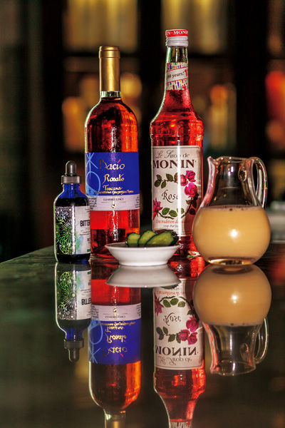 加冰把酒液与玫瑰糖浆一起摇匀,以青瓜片饰杯。