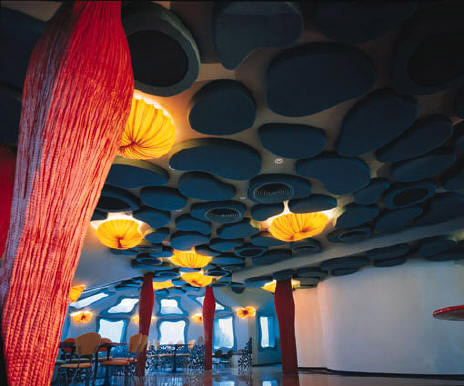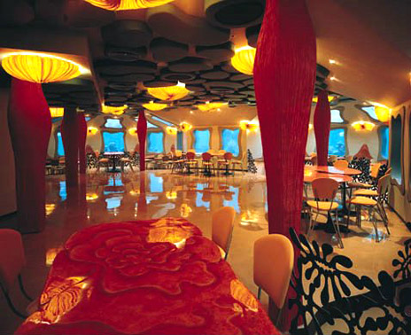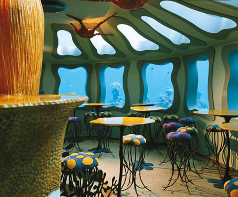 这是一座深入海底6米的餐厅,位于以色列南部,离Eilat湾海岸90米远。以海洋生物作布置设计,有水母型餐椅、海星顶灯、珊瑚灯饰及各种海草型铁花围柵等。