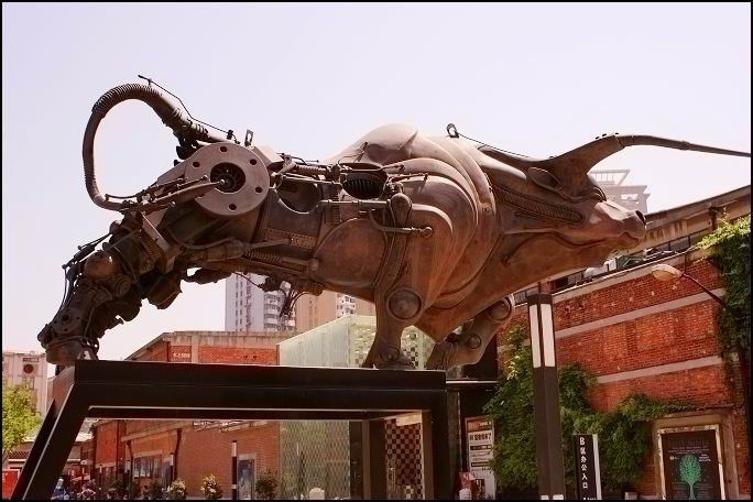 塑着高高的牛气冲天雕塑,材质是那种工厂拆下来的废机器组成的,应该是配合牛年而诞生的