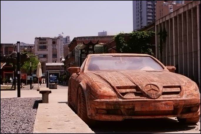红色姿态而鲜明的车子停在这里让人眼前一亮,完全以红砖材质组成,不过是全封闭的,汽车的门当然也不能打开。