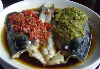让剁椒鱼头中要推荐的就是望湘园中的鸳鸯鱼头,望湘园的鸳鸯鱼头在上海滩可是小有名字,据店里的湖南大厨介绍,店里鱼头之所以特色首先是因为鱼头选料比别家贵,店里用的是天目湖的鱼头,相比本地鱼头,天目湖的鱼头不仅嫩滑,且更为肥腴,而且他们家选用的剁椒也是从湖南当地做剁椒最有名的湘潭运过来的,而这种翠绿爽口的辣椒在湖南叫酱椒。将新鲜的鱼头事先加盐和密料腌制好之后,再放上剁椒和酱椒,最后放进蒸炉里蒸熟,一道美味的鸳鸯鱼头就可以端上餐桌了。