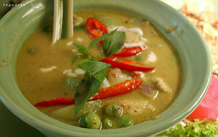 经典的绿咖喱是用小碗乘至。加入了太过独有的香料更显清雅。