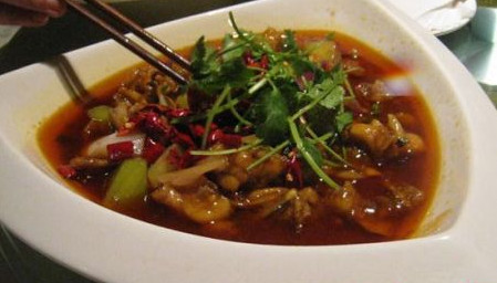 店堂是红黑相间的色调,说不上豪华,但带着时尚的味道。菜式不算出挑,味道不错,分量也足。他家不供应酸梅汁,这点在川菜店里比较少见。冷菜里的西施玉米出乎意料地清爽,颜色很丰富,入口有点酸酸的,好吃!晾衣白肉,这个要推荐一下,薄薄的薄饼包着切好的一片一片的肉和黄瓜,再蘸上特制的酱料味道真的很好,虽然肉看上去有点肥,但是入口肥而不腻,推荐推荐。冰心木瓜也是他家的一道特色。
