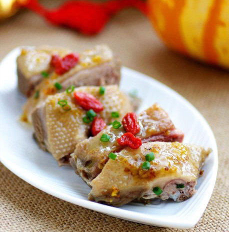 用料:鸭肉1000克、食盐适量、葱适量、蒜3瓣、陈皮3片、糖桂花5汤匙、白醋2汤匙