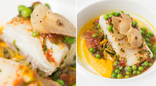 比如说他的一道真鲷配香菜汁竹笋西芹及豇豆,真鲷去皮、去刺,撒上盐和胡椒调味后,静置15分钟待其出水,将鱼肉与百里香、鸭油一起放入真空袋,抽尽空气置于60摄氏度的水温中慢煮10-12分钟。此后在装盘时取预先准备好的竹笋丁、西芹丁和豇豆丁,倒入香菜汁,将鱼肉铺于上,撒上炸过的蒜片,以增加香脆的口感。不仅真鲷在慢煮过程中保留了汁水与嫩度,更一次性将百里香和鸭油的香气深插入鱼肉之中,慢煮后再进行最后的调味,口味丰富。