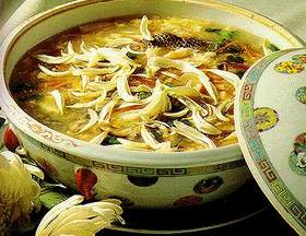 菊花黄鱼羹,江南菜羹。是由杭州名菜宋嫂鱼羹演变而来。以黄鱼或鲜活淡水鱼(鳜鱼最佳)中段为主料,配以豆腐、火腿、鸡煮制而成。此菜创于南宋,因中南海鲜美,流传至今。