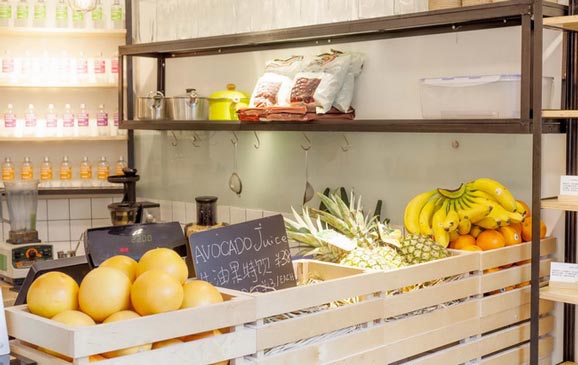 说到 fancyfruit,其实不能笼统地用“果汁店”来描述这家只有 18 平方米、开了不到半年的小店,因为除去鲜榨果汁等水果冷热饮品,店里还有很好吃的蔬果派、自制酸奶以及各种水果制作的相关产品:新疆的干果、南京的枇杷膏等等。