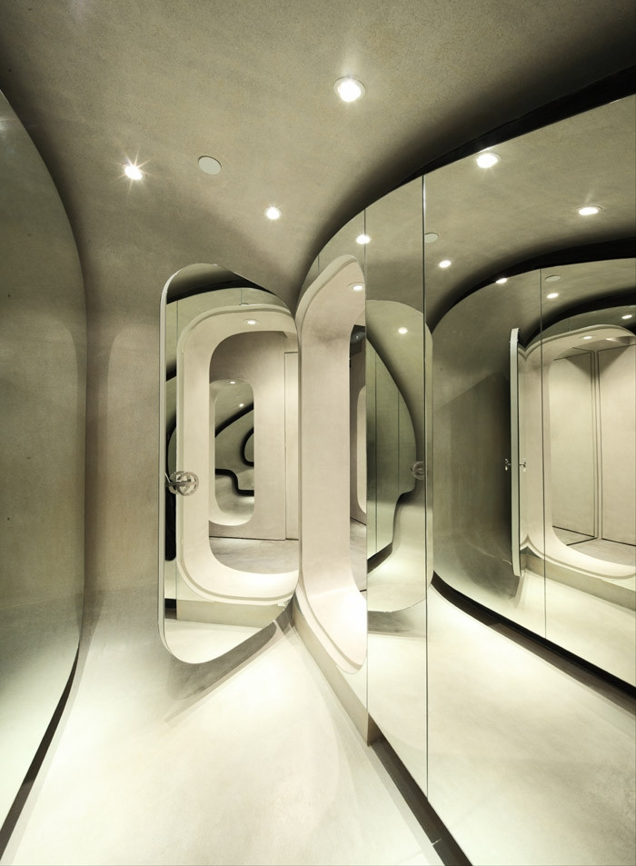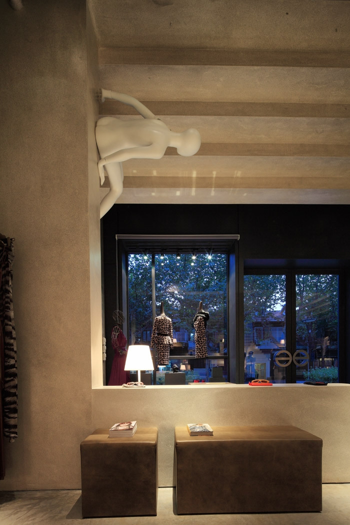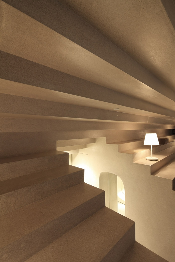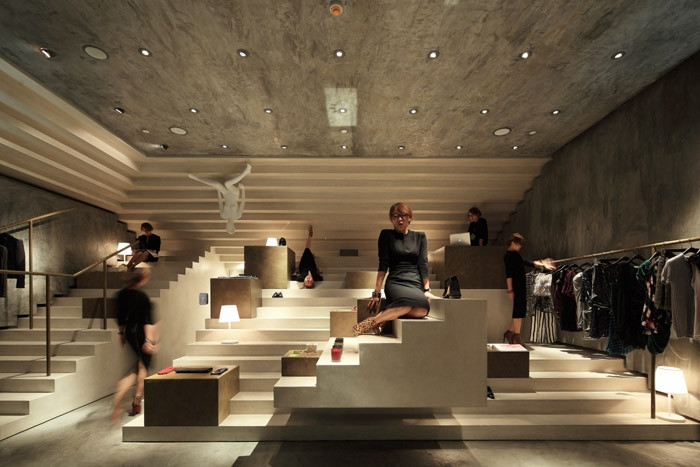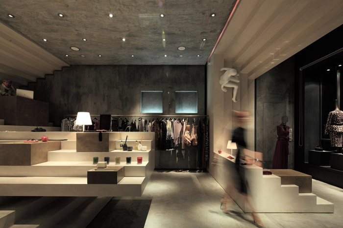 凹凸前沿设计概念店位于中国上海商业繁华区的东方新天地,这里有过著名的石库门区改造案例,建筑多为两三层,在高楼毗邻的上海显得与众不同,体现了上海休闲的一面,新天地定位比较高端新潮,是吸引当地人和游客的好去处。概念店由Francesco Gatti设计,而这个店的主人是空姐出身的龙霄Sonja Long,她成功的转行入时尚界,她曾经在其它的采访中表示“我想创造一个成人游乐场,一个不只是购物的地方。”她是时尚界的专业买手,将欧洲那些在中国还不为人知的时髦潮流带到中国。在这个有限面积(100平米)的店里面,店主人希望:“不仅有衣服,还可以看到室内设计、工业设计,更多的东西”。设计师和店主的合作非常愉快,最后设计师创造了一个有力的连续的空间,从天花到地面蔓延这阶梯,家具不仅仅是家具,也是空间的一部分,并延续了视线。同时设计师剔除多余元素,保持设计的纯粹。一系列模特随着阶梯的走向放置,定义出不同的空间感,模特腿略弯曲,呈现出隐约含蓄的东方之美。从第一个设计开始,Francesco Gatti便一直采用混合异构解决方案,抓住空间本质,找到人和空间的精髓,定义空间,同时不掩盖空间的使用功能。在此概念店设计当中采用了最少的语汇。建筑师Francesco Gatti于2002年在罗马成立办公室,2004在上海开办分部办事处,其业务范围横跨建筑,艺术及室内社计。