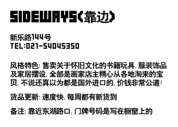 风格特色:台湾独立艺术工作者JACO开的店,广告和室内设计的深厚从业背景,全世界二十余个国家的游历体验,坚持品味和细节的他带给上海年轻人的是最纯正的美式休闲风。货品更新快,每周都有新货。