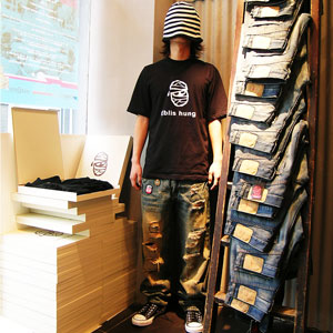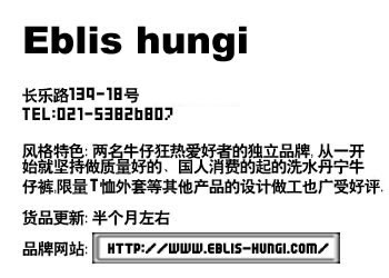 上海本地潮牌Eblis-hungi 国产Eblis hungi 品牌,这是两个牛人,爱牛狂热份子所创建的品牌,从一开始就坚持做质量好的、国人消费起的水洗单宁牛仔裤,限量T恤外套等其他产品的设计受到了潮友的全力支持和力挺。