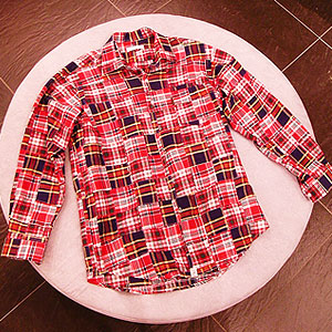 小丑这个图案的设计是Eblis hungi品牌一直要表达的可爱恐怖主题的最新诠释,而工业主题的螺丝螺帽主要是模仿Bape的配色来做的一款monogramT恤,一共八个颜色,拼布的衬衫是年初出的一个特别款式,只剩两件了.