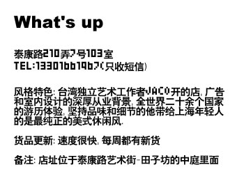 地址:上海卢湾区 泰康路270弄7号103室 (具体位置:泰康路艺术街-田子坊的中庭里面)