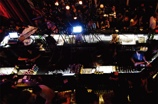 位于高腾大厦顶楼的MINT 拥有从四个角度俯瞰黄浦江两岸风光的理想位置,而会员制的入场许可又让这种排场变得更加私享化。当然,那个17 米长的巨大鲨鱼缸还是很有看点,以鲨鱼缸作为隔断,一旁是通往主开放式lounge 区的通道,另一面则是宽阔的卡座,高达7 米的全落地玻璃窗外似乎可以看尽上海天光,而20 余头鲨鱼在狭长的透明鱼缸里游弋,整个鲨鱼缸像是漂浮在空中的一段海底世界,相当梦幻。那个上千颗施华洛世奇水晶所打造的球体吊灯也同样很有看点,吊灯下面鲜红色真皮沙发所打造的酒吧区同卫生间、VIP 房等墙上的喷画一样,充满嬉皮的风格。吧台也是一大看点,近20 米长的中心吧台,完全够一个T 台的架势,事实上开幕当天,M1NT 员工制服的设计师陆坤的确在这里搞过一个很独特的fashionshow。最后值得一提的看点,就是卡座的所有家具都是如FENDI CASA这类一线的奢侈品,显然让每一个会员都觉得完全值回票价—而这也令MINT 看起来反而没有那么浓烈的夜店气,却很像大型Villa 里的豪华客厅。