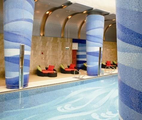 每家酒店都会有游泳池,可没想到,在繁忙的陆家嘴群楼中,在新天哈瓦那大酒店的顶层,还隐藏着一个让人迷醉的艺术游泳池,以不同蓝色瓷砖拼就的艺术图案,既有加勒比海的奔放不拘,又有海洋般的沉静深沉,在回旋的蓝色中,仿佛听到了波涛的声音。亮橙色的沙发,翠绿的靠垫,又带出了蓝色海洋中的清新之风,浪漫的梦幻,演绎出风情万种。在公共的游泳池两侧,靠窗还各有一个圆形浴缸,滴几滴精油,撒几朵玫瑰花瓣,在纷繁的城市上空,泡在一汪碧水中,饱览浦西浦东两岸美景。